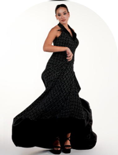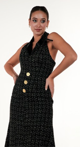Crafted in textured black tweed, Ember embodies quiet intensity and controlled strength. The halter neckline frames the shoulders with precision, leading into a sculpted bodice accented by gold buttons. Its fluid, elongated silhouette falls into a subtle train, balancing structure with movement. Clean tailoring enhances the waist while allowing ease through the hips.